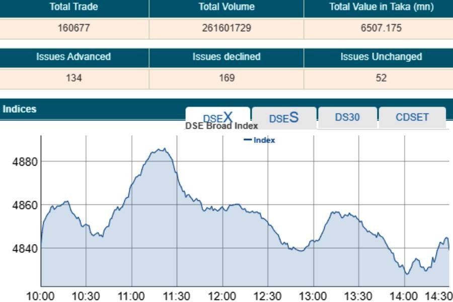 At the end of the session, DSEX, the prime index of the Dhaka Stock Exchange (DSE), saw a fractional loss of 0.80 point to settle at 4,839, after gaining 30 points in the previous day.