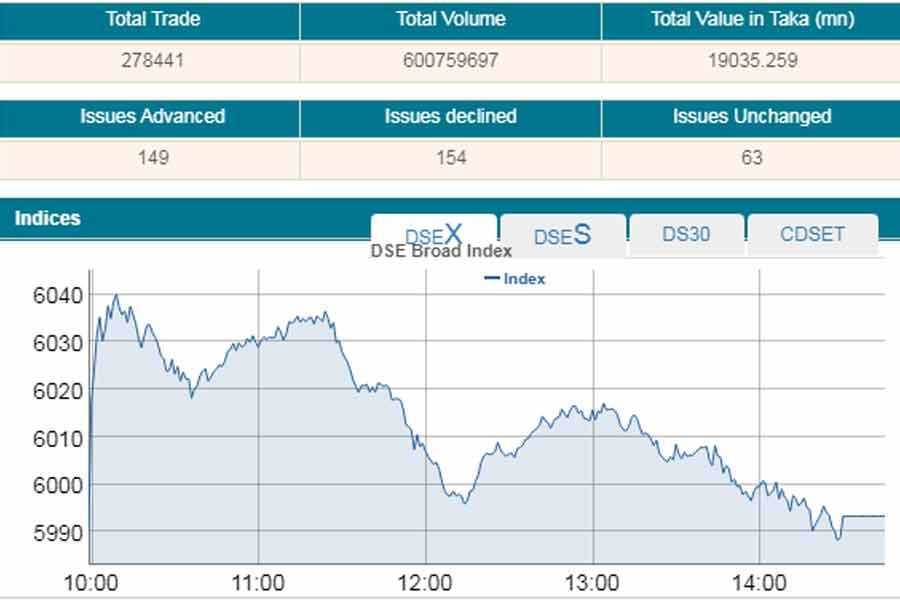 DSEX, the benchmark index of the DSE, went up by 2.34 points or 0.03 per cent to settle at 5,993, after losing 17.70 points in the previous day.