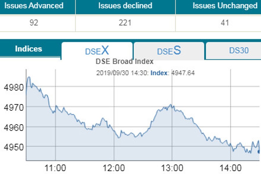 At the end of the session, DSEX, the prime index of the Dhaka Stock Exchange (DSE), went down by 28.10 points or 0.56 per cent to settle at 4,947.