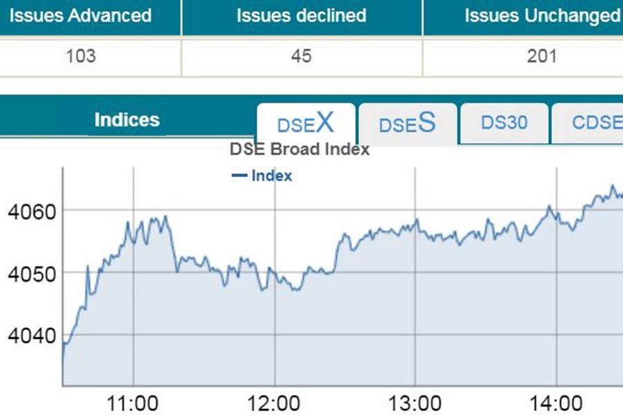 DSEX, the key index of the Dhaka Stock Exchange, went up by 26.91 points or 0.66 per cent to settle at more than one month high at 4,061 during four hours trading.