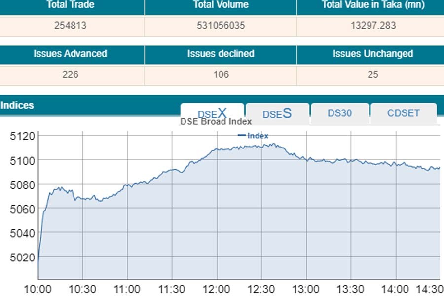 DSEX, the prime index of the Dhaka Stock Exchange, went up by 82.76 points or 1.65 per cent to settle at 5,094, which is the highest level of DSEX in more than a year since August 29, 2019.