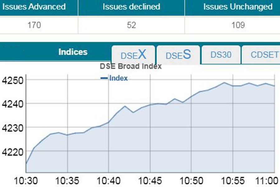 DSEX, the prime index of the DSE, went up by 34.20 points or 0.82 per cent to stand 4,248 points at 11:00 am.