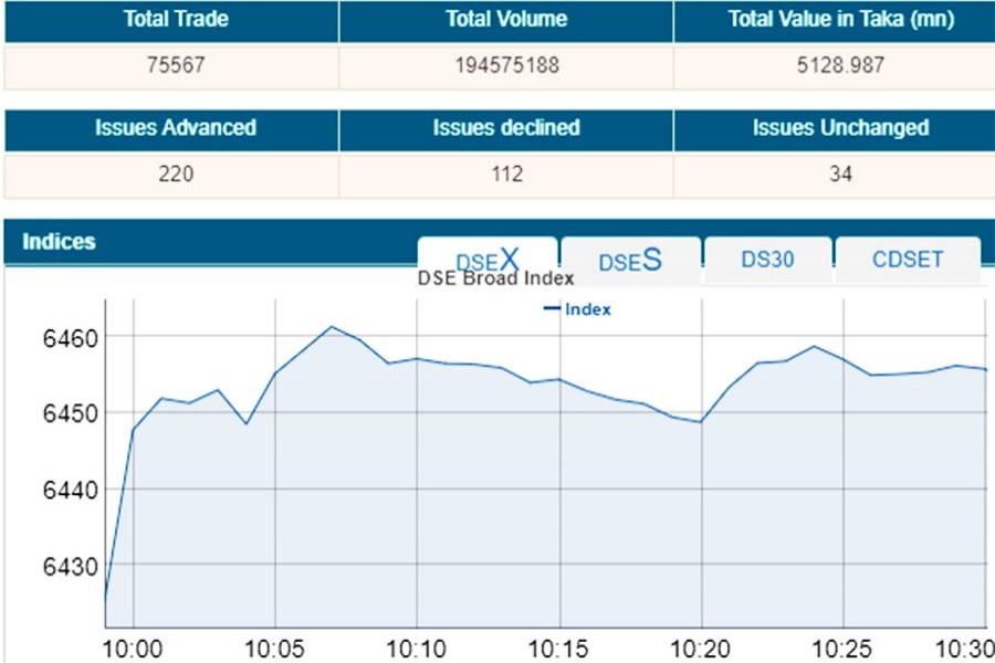 DSEX, the prime index of the Dhaka Stock Exchange (DSE), went up by 28.58 points or 0.44 per cent to stand at 6,453 points within the first 30 minutes of trading when the report was filed at 10:30 am, the highest since its inception in 2013.