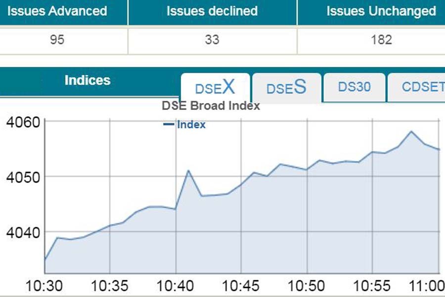 DSEX, the prime index of the DSE, went up by 22.50 points or 0.55 per cent to stand 4,057 points at 11:00 am.