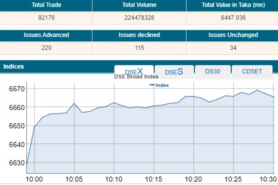The premier bourse continued to break their previous records with DSEX, the prime index of the Dhaka Stock Exchange (DSE), went up by 36.77 points or 0.55 per cent to stand at 6,664 points within the first 30 minutes of trading at 10:30 am –the highest since its inception more than eight years back in 2013.