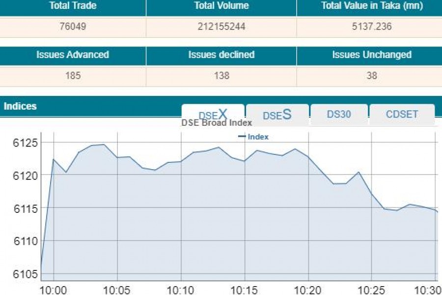 Turnover, another important indicator of the market, stood at Tk 3.38 billion within the first 30 minutes of trading at 10:30 am.