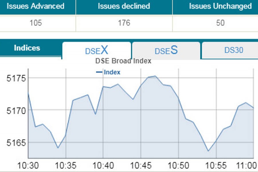DSEX, the prime index of the DSE, went down by 5.64 points or 0.10 per cent to stand 5,167 points at 11:00am.