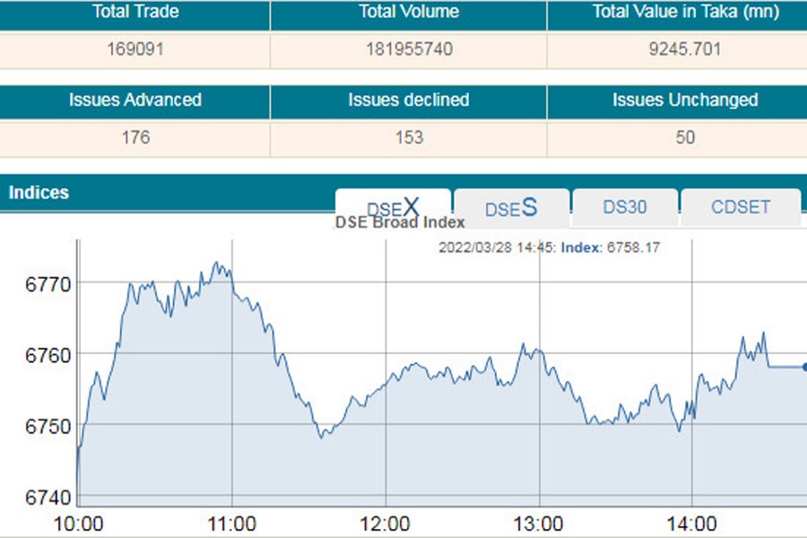 DSEX, the key index of the Dhaka Stock Exchange, went up by 16.61 points or 0.24 per cent to settle at 6,758, after losing over 11 points in the previous day.