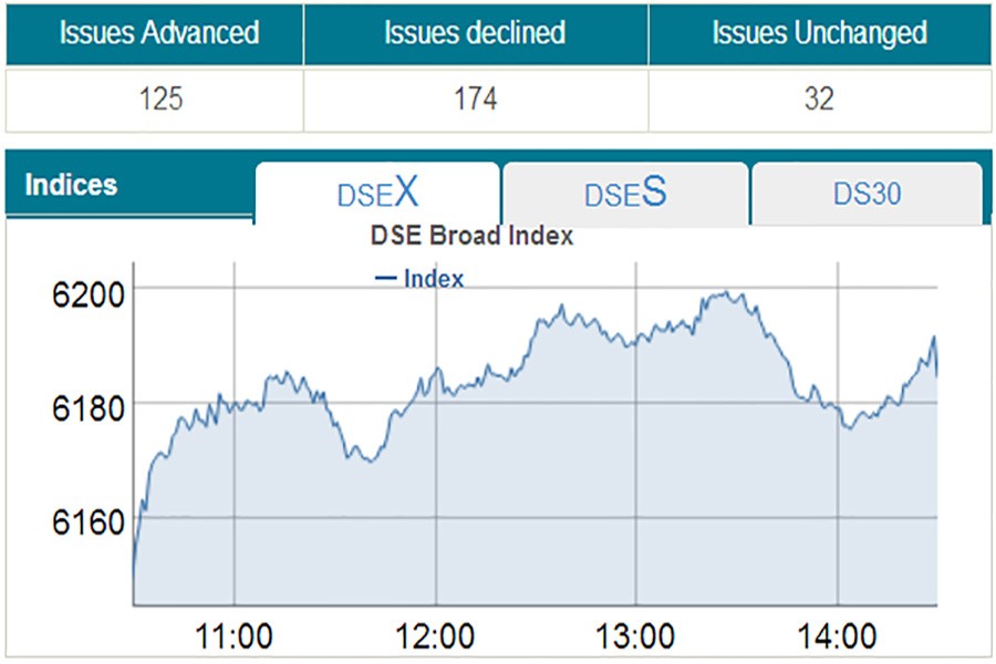 DSEX, the core index of the DSE, which replaced the DGEN in four-and-a-half-year back, settled at nearly 6,184 points, after gaining 35.17 points or 0.57 per cent over the previous session.
