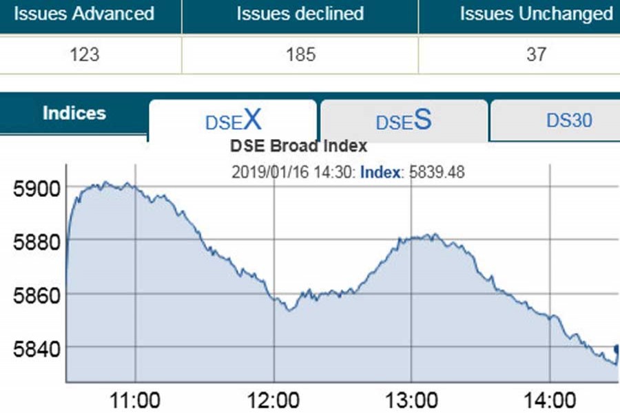 At the end of the session, DSEX, the prime index of the Dhaka Stock Exchange (DSE), went down by 23.79 points or 0.40 per cent to settle at 5,839.