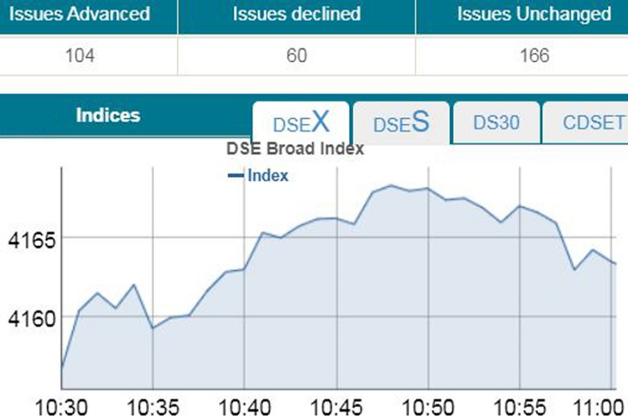 DSEX, the prime index of the DSE, went up by 3.68 points or 0.08 per cent to stand 4,160 points at 11:00 am.