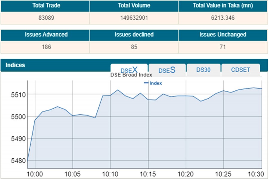 The market opened higher and DSEX, the benchmark index of the Dhaka Stock Exchange (DSE), rose 24.63 points or 0.38 per cent to stand at 5,504 points within the first 30 minutes of trading.