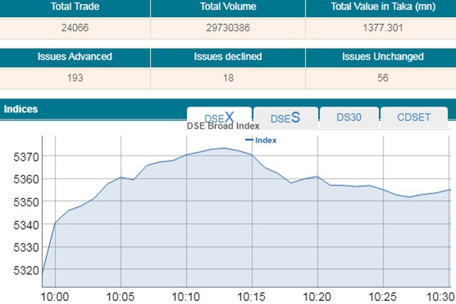 DSEX, the prime index of the DSE, went up by 38.04 points or 0.71 per cent to stand 5,355 points till then.