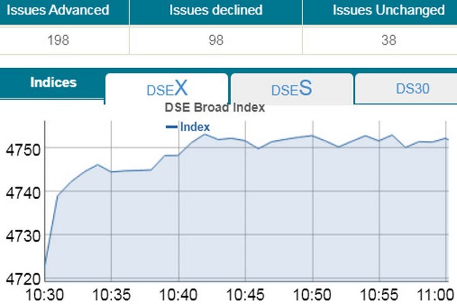 DSEX, the prime index of the DSE, went up by 27.16 points or 0.57 per cent to stand at 4,749 points at 11:00am.