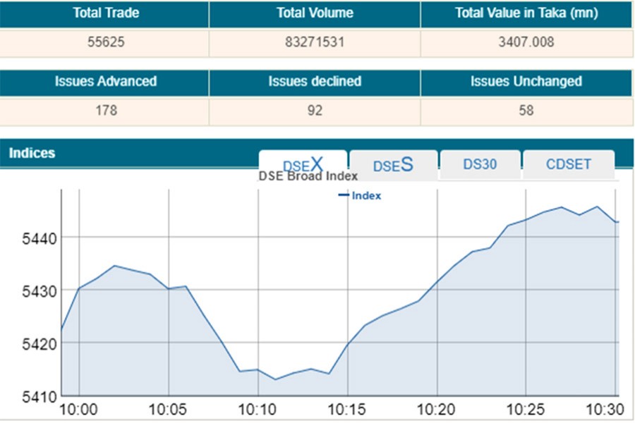 The market opened higher and the DSEX, the prime index of the Dhaka Stock Exchange (DSE), rose 23.16 points or 0.42 per cent to stand at 5,445 points within the first 30 minutes of trading.