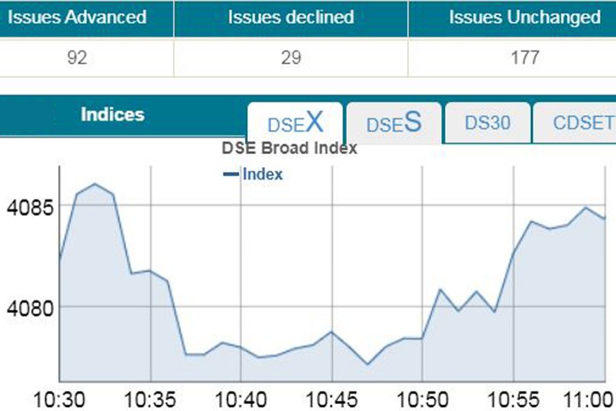 DSEX, the prime index of the DSE, went up by 1.63 points or 0.04 per cent to stand 4,083 points at 11:00 am.