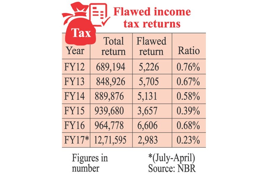 In recently compiled statistics of the NBR, the number of erroneous tax returns was found coming down significantly in a year as people became more conscious over their tax returns and simplification of the return-filing process.