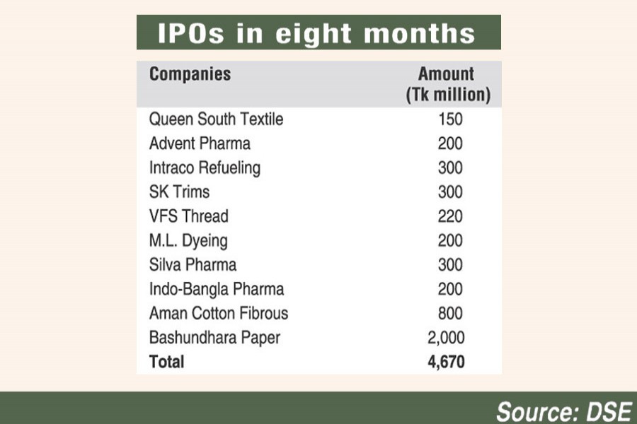 Ten cos raise Tk 4.67b through IPOs in eight months this year