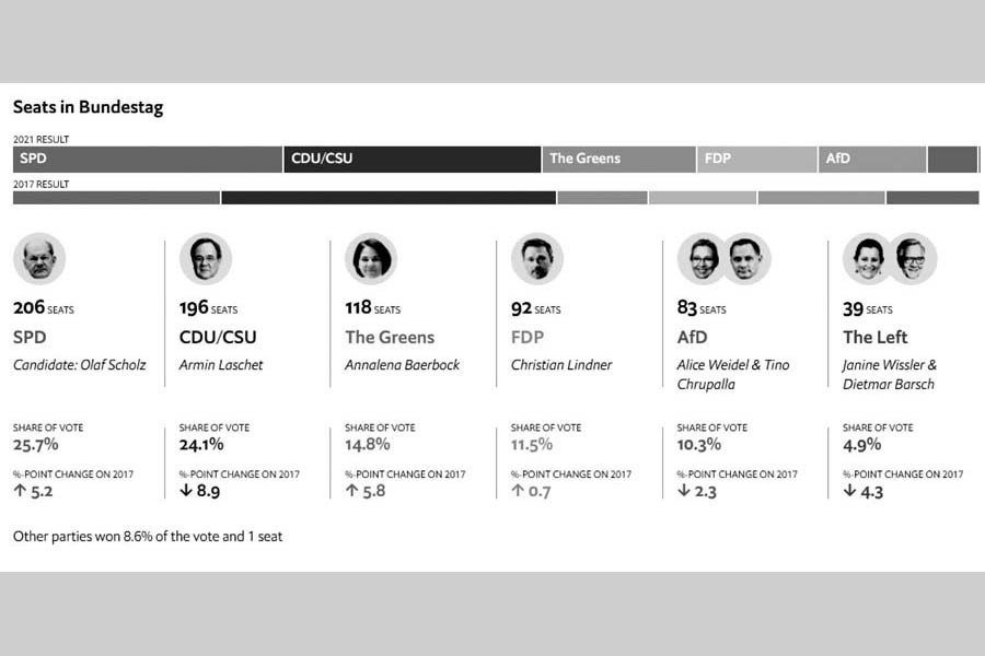 Germany's centre-left Social Democrats (SPD) have narrowly won the country's federal elections, beating the party of outgoing Chancellor Angela Merkel, according to preliminary results. The SPD secured 25.7 per cent of the vote, while the ruling conservative CDU/CSU bloc gained 24.1 per cent. The Greens achieved the best result in their party's history, coming in third with 14.8 per cent of the ballot. The far-right Alternative for Germany, which no one else wants to work with, saw its vote share declining to about 10.6 per cent - about 2 percentage points less than in 2017 when it first entered the German Parliament.