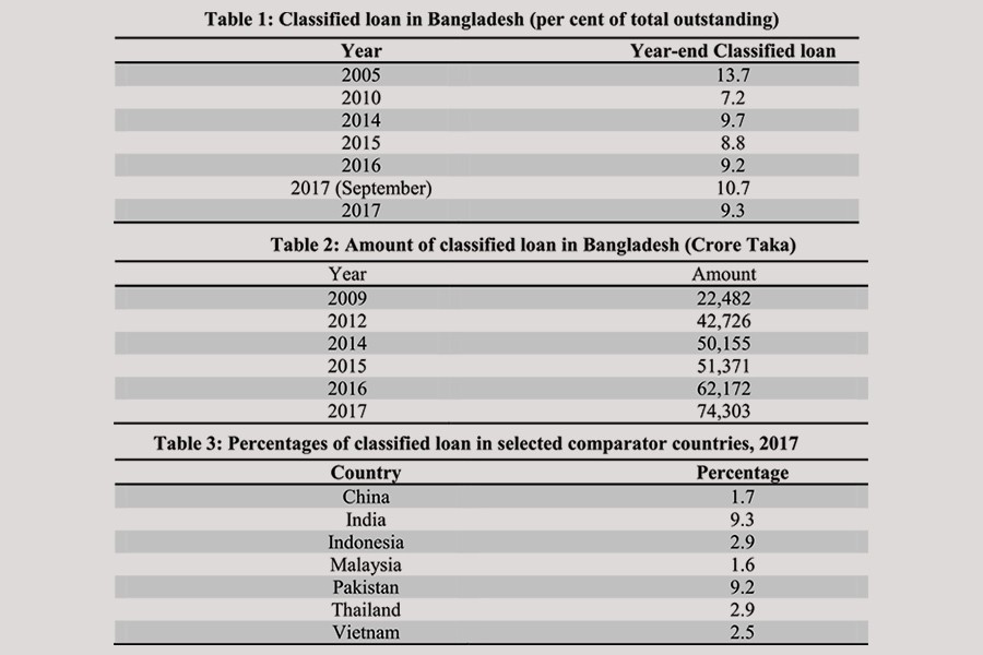 THE QUANTITATIVE DIMENSION: Non-performing loan as a proportion of outstanding loan which was 7.2 per cent in 2010, reached 10.7 per cent in September 2017. These numbers, however, understate the magnitude of the problem because these exclude the amounts rescheduled/ restructured or written off. As of September 2017, for example, an amount of TK 450 billion (45000 crores) was written off. In December 2017 non-performing loan ratio fell somewhat to 9.3 per cent (See table 1). Nevertheless, in absolute term the amount continued to grow. As of December 2017, the amount was TK 743.03 billion of 74303 crores (See table 2) of which 57 per cent was attributable to state-owned banks. Moreover, the non-performing loan ratio in Bangladesh is much higher than in our neighboring countries excepting India and Pakistan (See table 3).