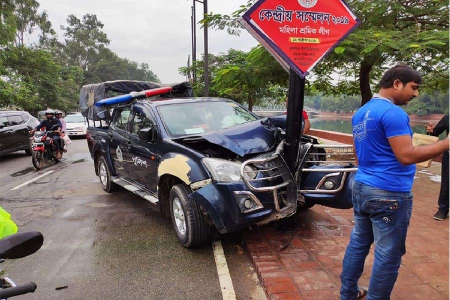 Jane Alam Munshi, officer-in-charge of Sher-e-Banglanagar Police Station, said the police vehicle ploughed through a footpath while giving side to a motorbike coming from the opposite direction around 10:00 am, leaving three people injured.