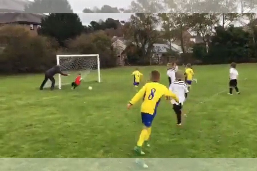 The video of the children's game in Bow Street, near Aberystwyth in Wales in the United Kingdom shows under-8s goalkeeper Osian saving a shot - but only after being pushed on to the ball.