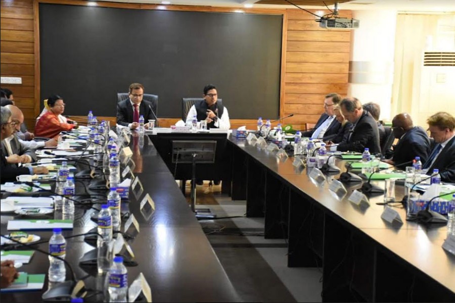 The delegation members including executive directors Geir Haarde, DJ Nordquist, Patrizio Pagano, Jorge Chavez Presa, Jean-Claude Tchatchouang, Herve de Villeroche, host directors, Kulaya Tantitemit, Aparna Subramani, Merza Hasan, Alternative executive directors, Gerard Antioch, Nathalie Francken.