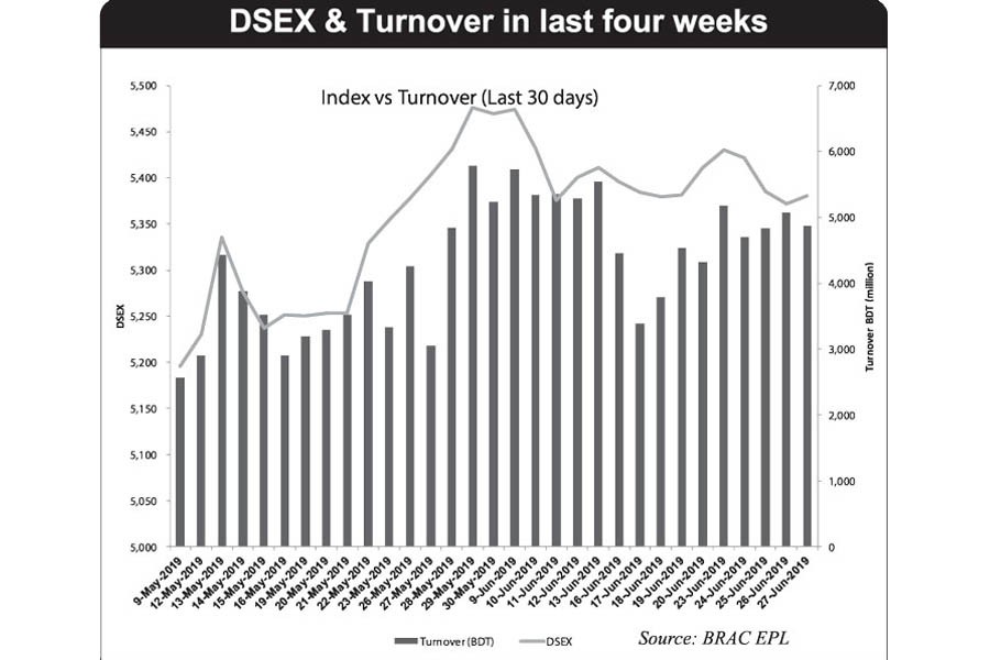Week-on-week, DSEX, the prime index of the Dhaka Stock Exchange (DSE), went down by 49.26 points or 0.91 per cent to settle the week at 5,380.
