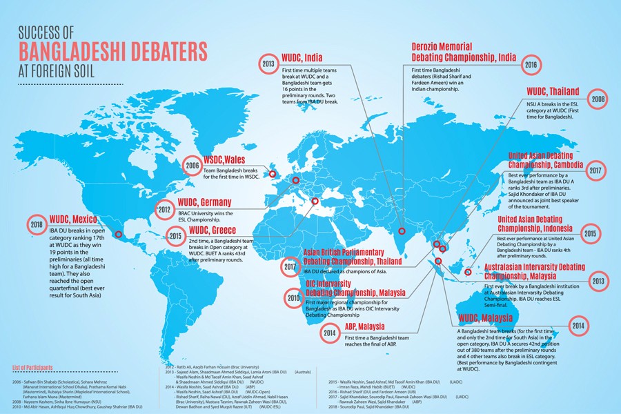 The achievements of Bangladeshi debaters can be outlined through the infographic. Special thanks to the Bangladesh Debating Council (BDC) and Adel Mostaque Ahmed, assistant manager-Business Development, I-Venture Limited and co-founder, ChanGen for helping in developing this infographic.