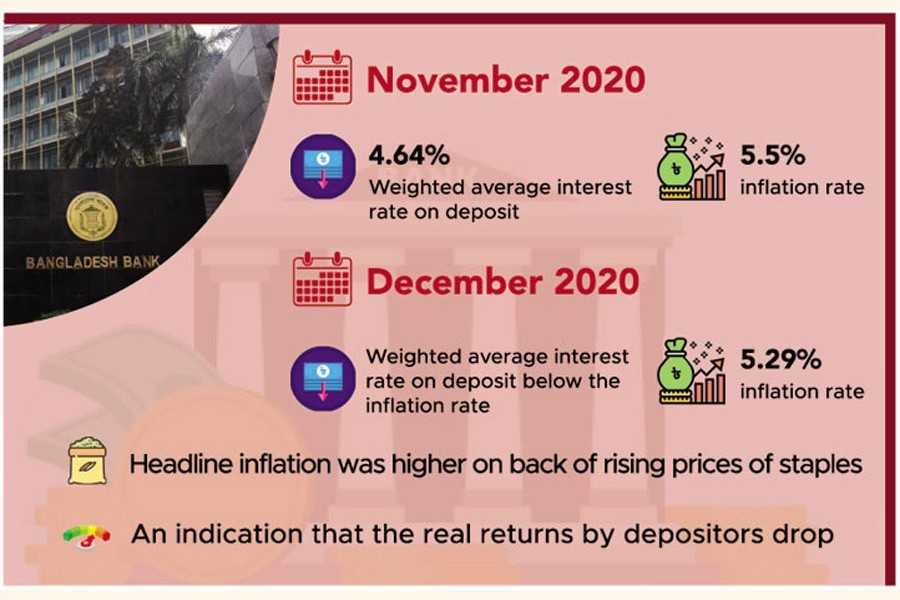 In November last year, the weighted average interest rate on deposits stood at 4.64 per cent, lower than 5.5 per cent rate of inflation in the same month, according to the Monetary Policy Review-December 2020 of the Bangladesh Bank.