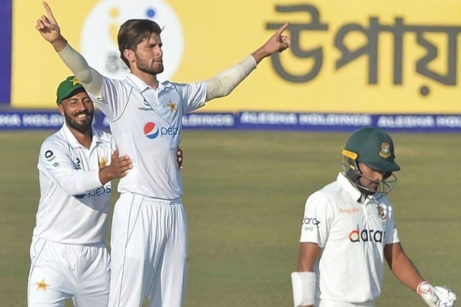 Bangladesh ended their second innings at 157 in 56.2 overs despite a fifty from Liton Das who also hit a hundred in the first innings. He was accompanied well by debutant Yasir Ali who later was hurt hard in his head by a nasty bouncer by Shaheen Afridi.