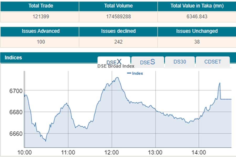 DSEX, the core index of the Dhaka Stock Exchange, went down by 6.26 points or 0.09 per cent to settle at 6,691, after losing over 67 points in the previous day.