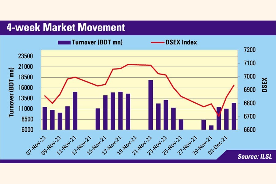 Week on week, DSEX, the prime index of the Dhaka Stock Exchange (DSE), climbed 84.11 points or 1.23 per cent to settle the week at 6,936, after losing 240 points in the week before.