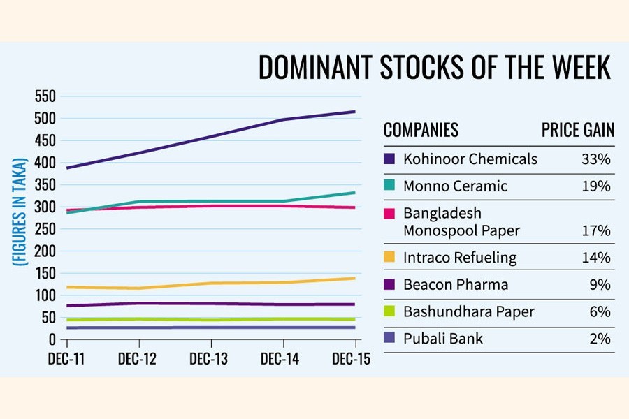 The stocks -- Kohinoor Chemicals, Beacon Pharma, Monno Ceramics, Interco Refueling Station, Pubali Bank, Bangladesh Monospool Paper Manufacturer and Bashundhara Paper Mills -- helped the market gain 17 points in the five-day period through Thursday, according to EBL Securities.