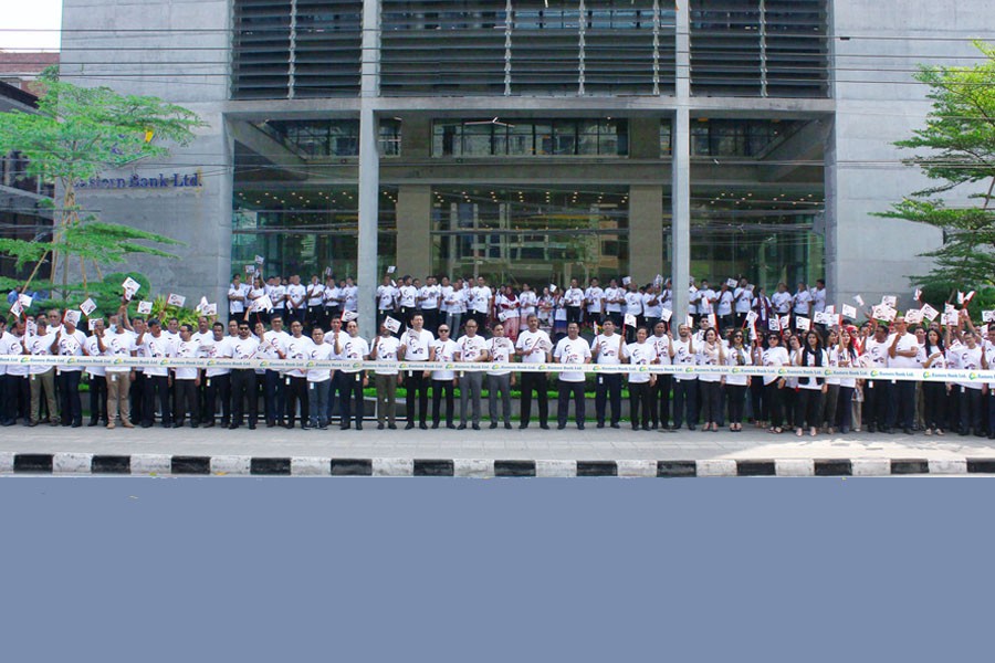Cutting a special birthday cake, the EBL family donned in T-Shirts with Mujib 100 Year logo assembled in front of the bank’s head office to display ceremonial placards for 10 minutes starting from 10:00 am.