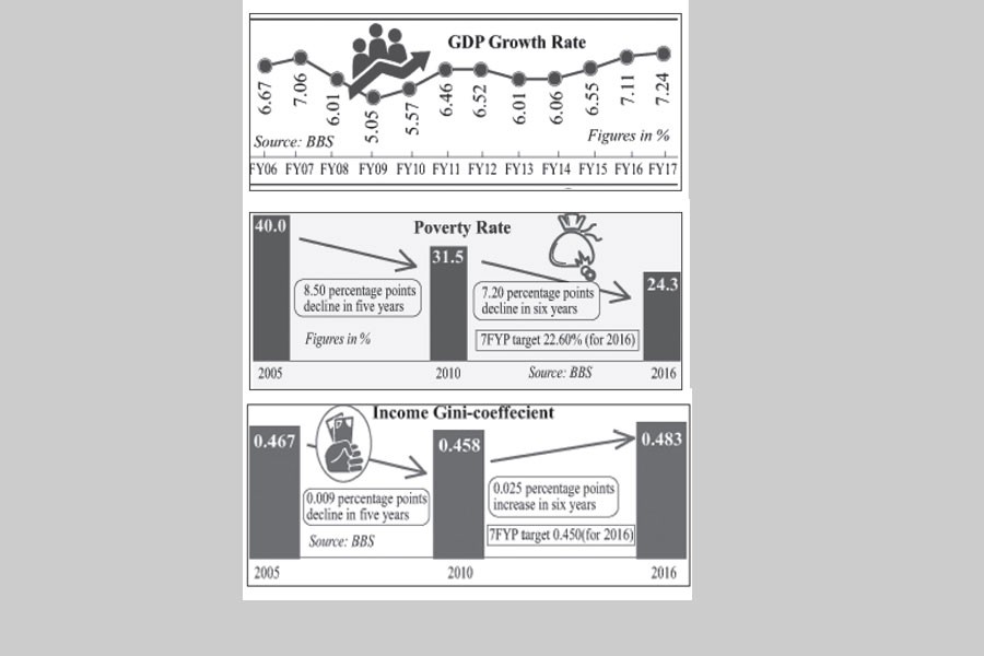 Achieving the growth target is considered a very big success. But, neither the targets of poverty reduction nor lowering income inequality have been achieved. The 7FYP targets to bring down poverty rate at 22.60 per cent while the actual rate stood at 24.30 per cent in 2016. In a similar vein, Gini co-efficient increased to 0.483 against the target of 0.450 in the year. Failure to achieve the targets simply demonstrates that higher growth is not contributing towards balanced development.