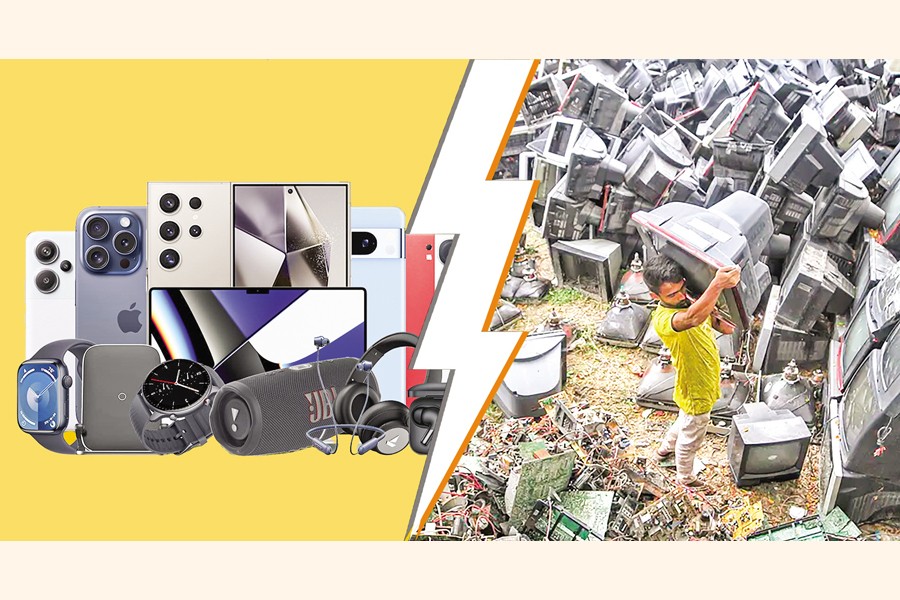 But the consequences are not only mental or social. Hidden in this sea of screens is a silent environmental crisis. The obsession with devices - and the resulting obsolescence - is creating a growing mountain of discarded electronics. Most users have no idea where their old phones go once they are replaced. Many simply end up in drawers, forgotten. Others are dumped, sold, or scavenged. Each year, Bangladesh generates nearly three million metric tons of electronic waste. While shipbreaking contributes a significant portion, discarded household gadgets - phones, TVs, chargers, laptops - are fast becoming a major source. And because there is no effective nationwide e-waste policy in place, much of this ends up in informal recycling yards where safety protocols are nonexistent.