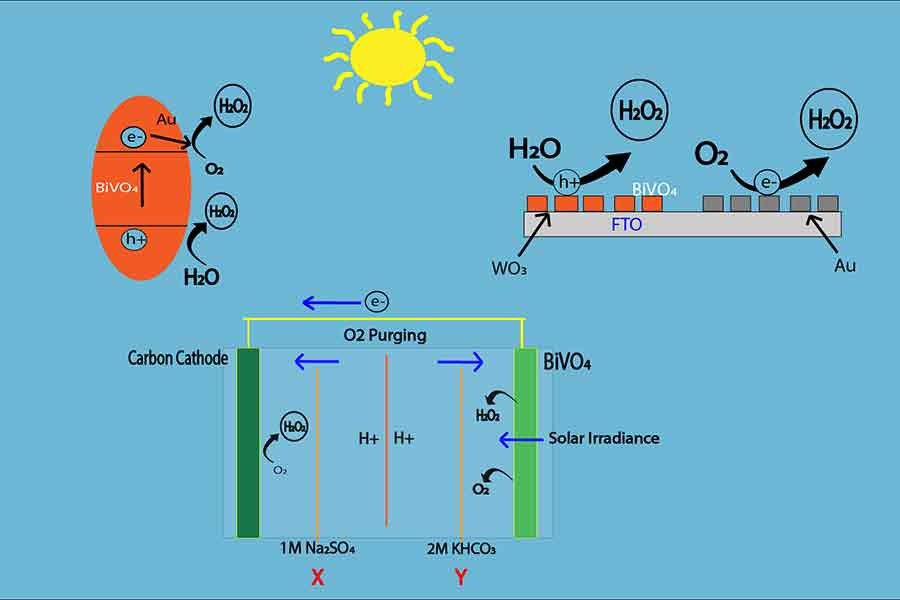 There are two chambers - Cathode (chamber X) and anode (chamber Y). The two chambers are detached by the membrane. The anode is open for sunlight but the cathode is away from the sunlight. When the Sun rays hit the photocatalyst BiVO4, the energy of light creates a bias of electrons to the cathode. As a result, to fill the gap of electrons in the electrode, water molecules in the anode chamber (chamber Y) release electrons, and H2O2 is created by oxidation reaction.