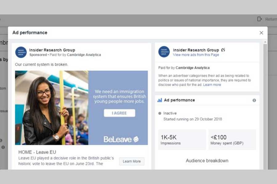 The ad, now removed but still visible in Facebook's new ad transparency portal, uses the logo of EU referendum campaign group BeLeave, which, in July, was found to have broken electoral law, reports BBC.