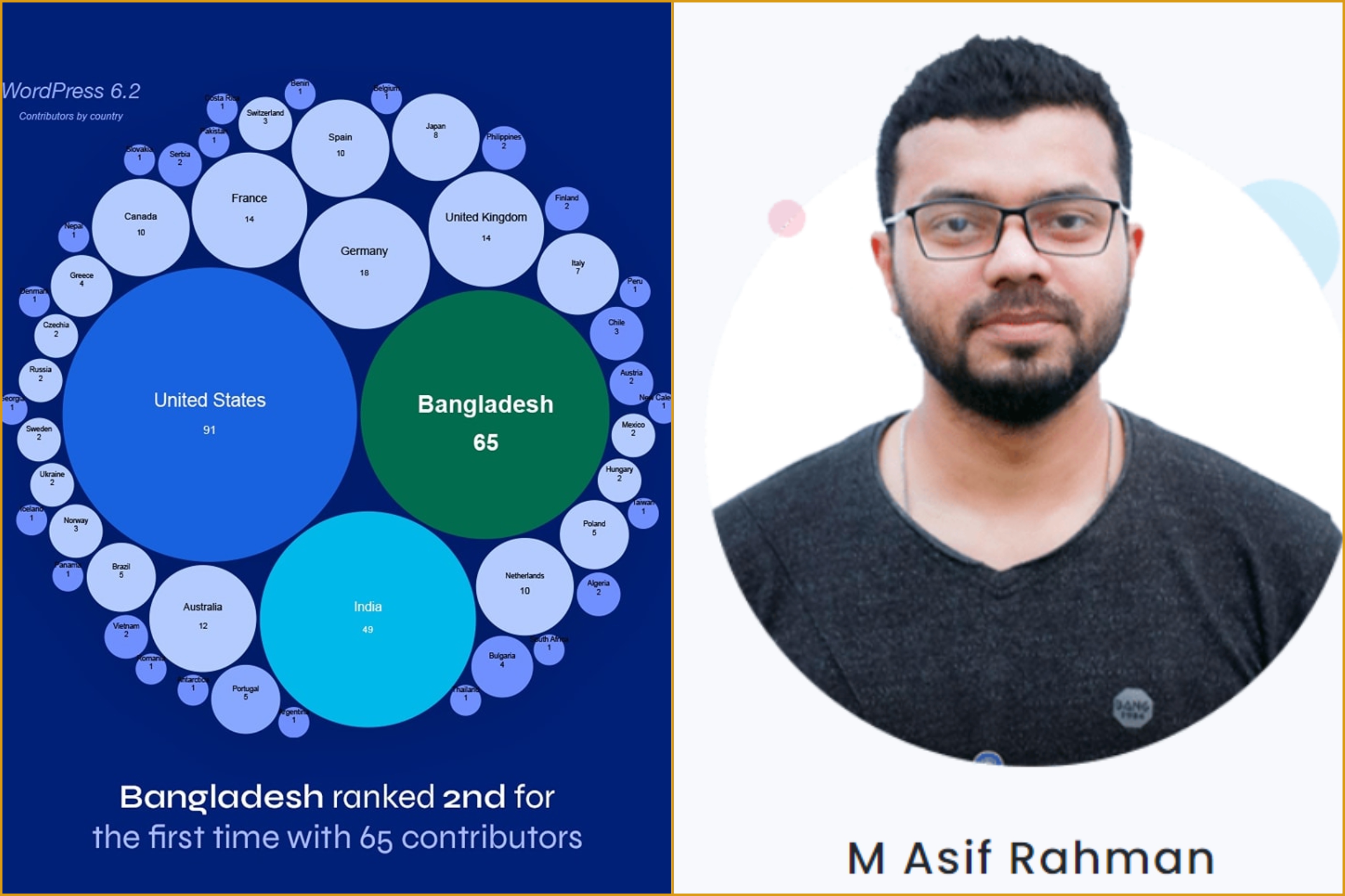 Founder of WPDeveloper M Asif Rahman said, "We dreamed of something big, which seemed rather impossible, never been done before, not even close. In WordPress 6.2 release, we not only had 65 core contributors from Bangladesh, but we also ranked Country No. 2 in terms of the highest number of core contributors in this version, surpassing India for the first time ever."