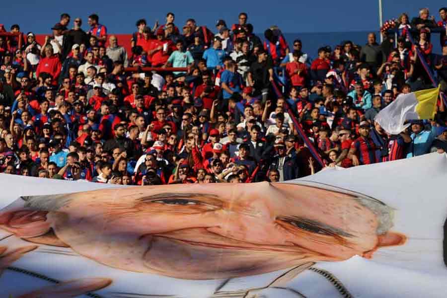 From flags to a life-size statue, images and homages to Pope Francis were visible all around the Pedro Bidegain stadium in Buenos Aires on Saturday as his beloved San Lorenzo de Almagro football team took to the field for the first time since the pontiff's death.