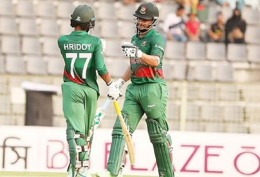 Shakib (93) and Hridoy (92) paired in a striking 135-run stand for the fourth wicket before a quickfire 26-ball 44 by Mushfiqur Rahim pushed Bangladesh to the huge total at the Sylhet International Cricket Stadium on Saturday.