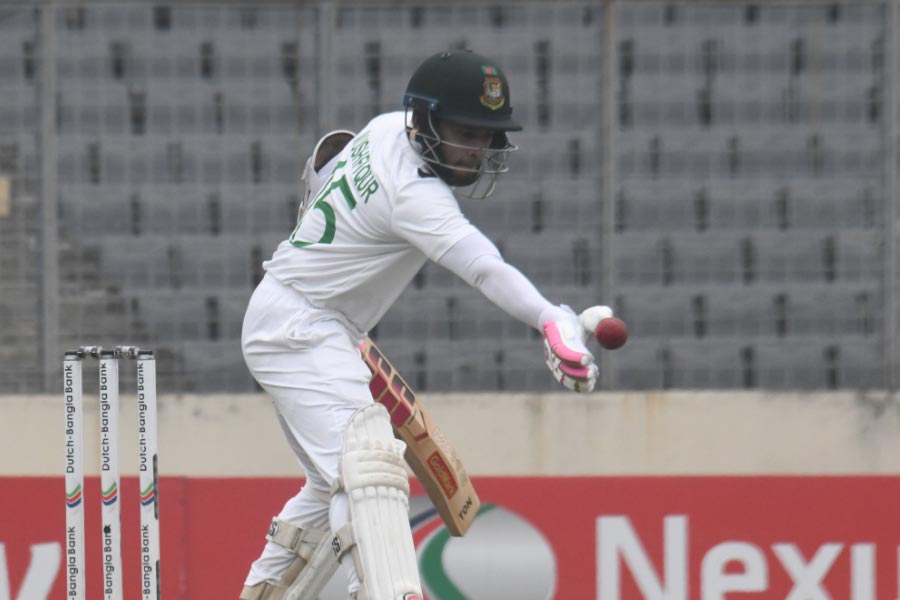 Bangladesh is facing challenges in the Dhaka Test, having lost four wickets in the first session, with Mushfiqur's unexpected dismissal marking their sixth wicket with only 123 runs on the board.