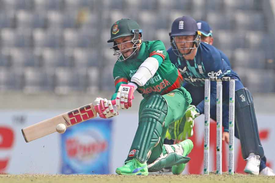 Bangladesh’s left-hand batter Najmul Hossain Shanto struck his maiden half-century. He scored 58 runs off 82 against a much-vaunted bowling attack from England. The top scorer of the recently-ended BPL came to bat at the number three position and hit six boundaries in his innings, which gave the side a platform.