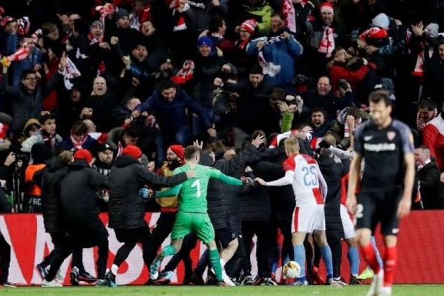 Five-time Europa League winners Sevilla were knocked out by a last-minute Slavia Prague goal in extra time in a dramatic finish to their last-16 tie on Thursday.