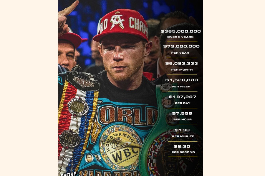 Unified middleweight world champion Canelo Alvarez and the streaming service DAZN have agreed to a five-year, 11-fight deal that will pay the boxer at least $365 million - the highest-paying athlete contract in history, reports Reuters.