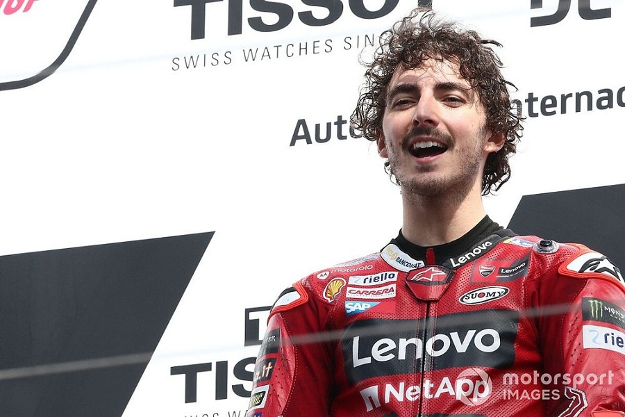 After crossing the finish line, Bagnaia delightedly punched the air. Upon dismounting his bike, he added a touch of flair to his victory celebration, slam dunking a basketball and adorning his fingers with three gold rings.
