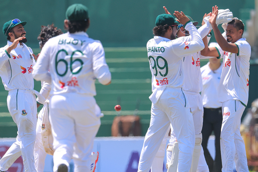 Nayeem (5-121) got in on the action in the following over, catching an edge from Kamindu (87) on the way through for wicketkeeper Litton Das’s third catch of the morning.