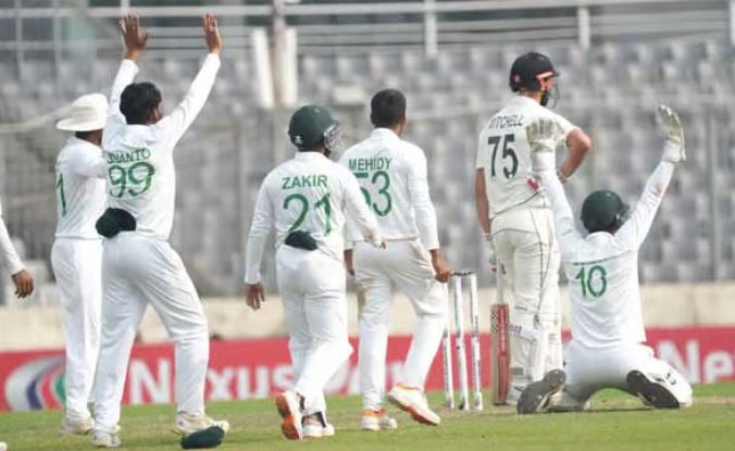 Bangladesh had resumed on their overnight score of 38-2 but lost wickets cheaply in the morning as spinners Patel (6-57) and Santner (3-51) took advantage of the turn on offer to heap pressure on the batsmen.