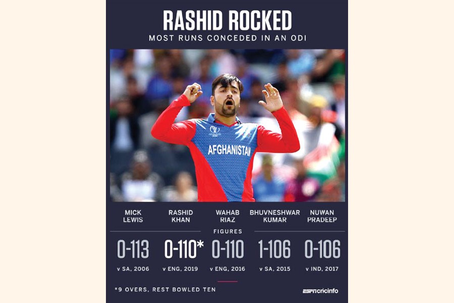 MANCHESTER, June 19 (PTI): Afghanistan leg-spinner Rashid Khan endured on Tuesday the ignominy of becoming the most expensive bowler in World Cup history during their match against hosts England at Old Trafford here.